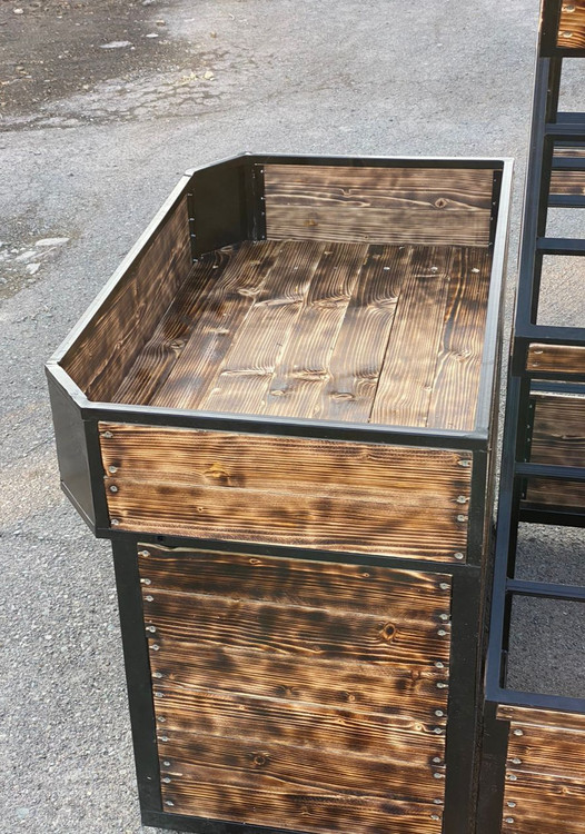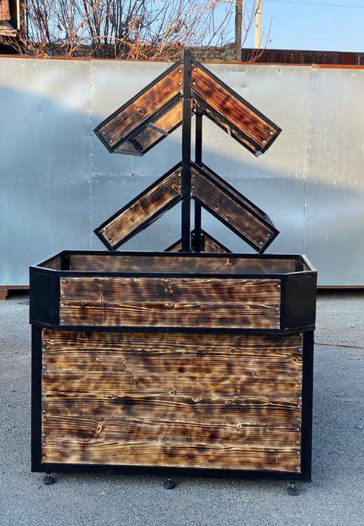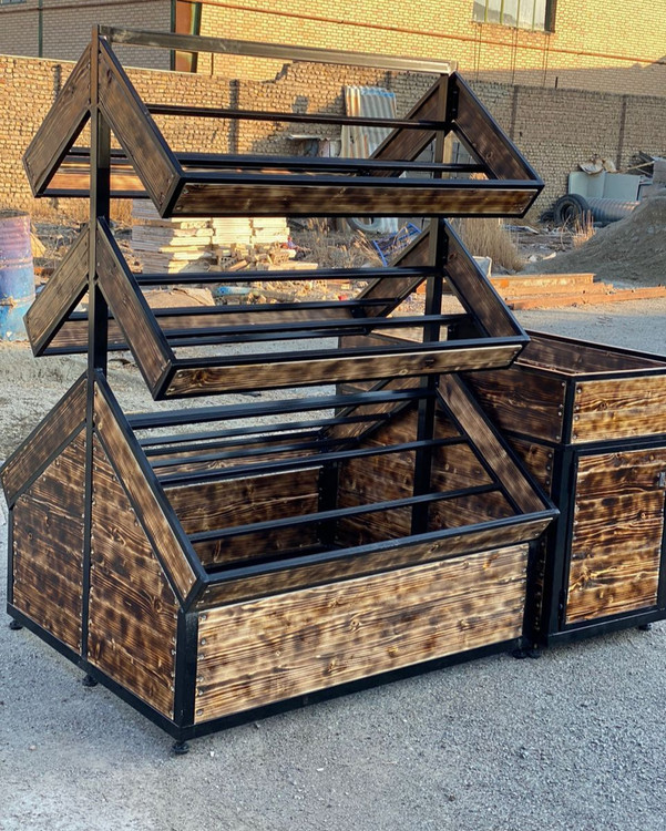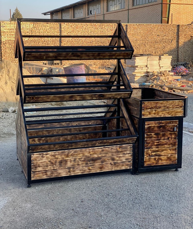 استند میوه طرح ترمو ،طرحی متفاوت و خاص ترکیب چوب و فلز میباشد . ستون مرکزی پروفیل 40*40 و طبقات از پروفیل 20*20 ساخته شده . رنگ بدنه فلزی به سفارش مشتری قابل تغییر میباشد .